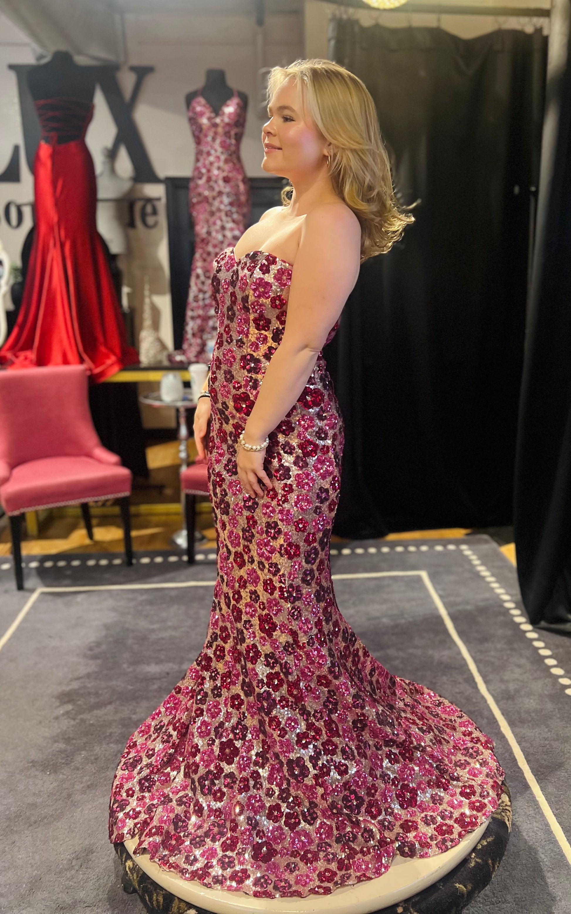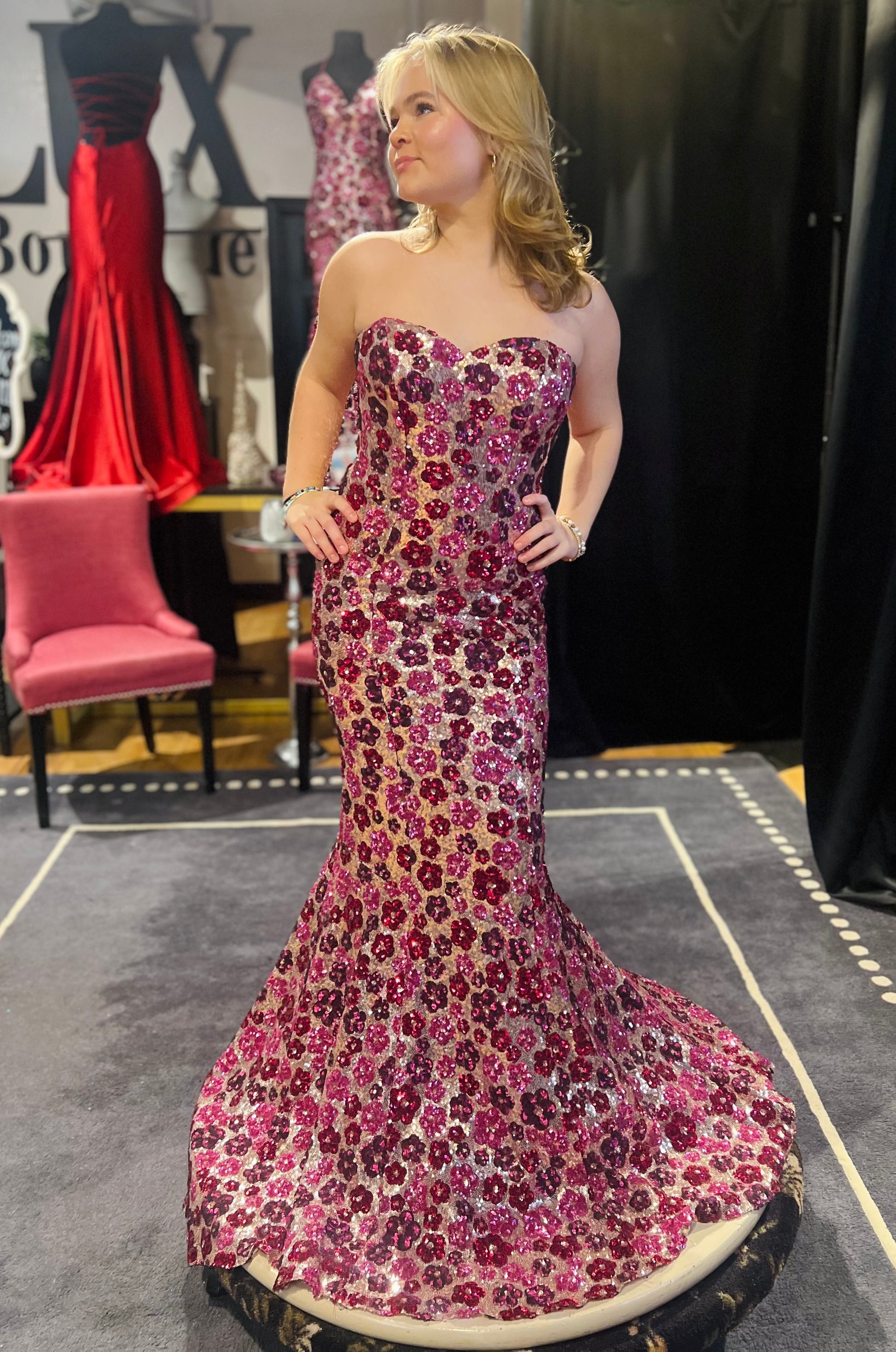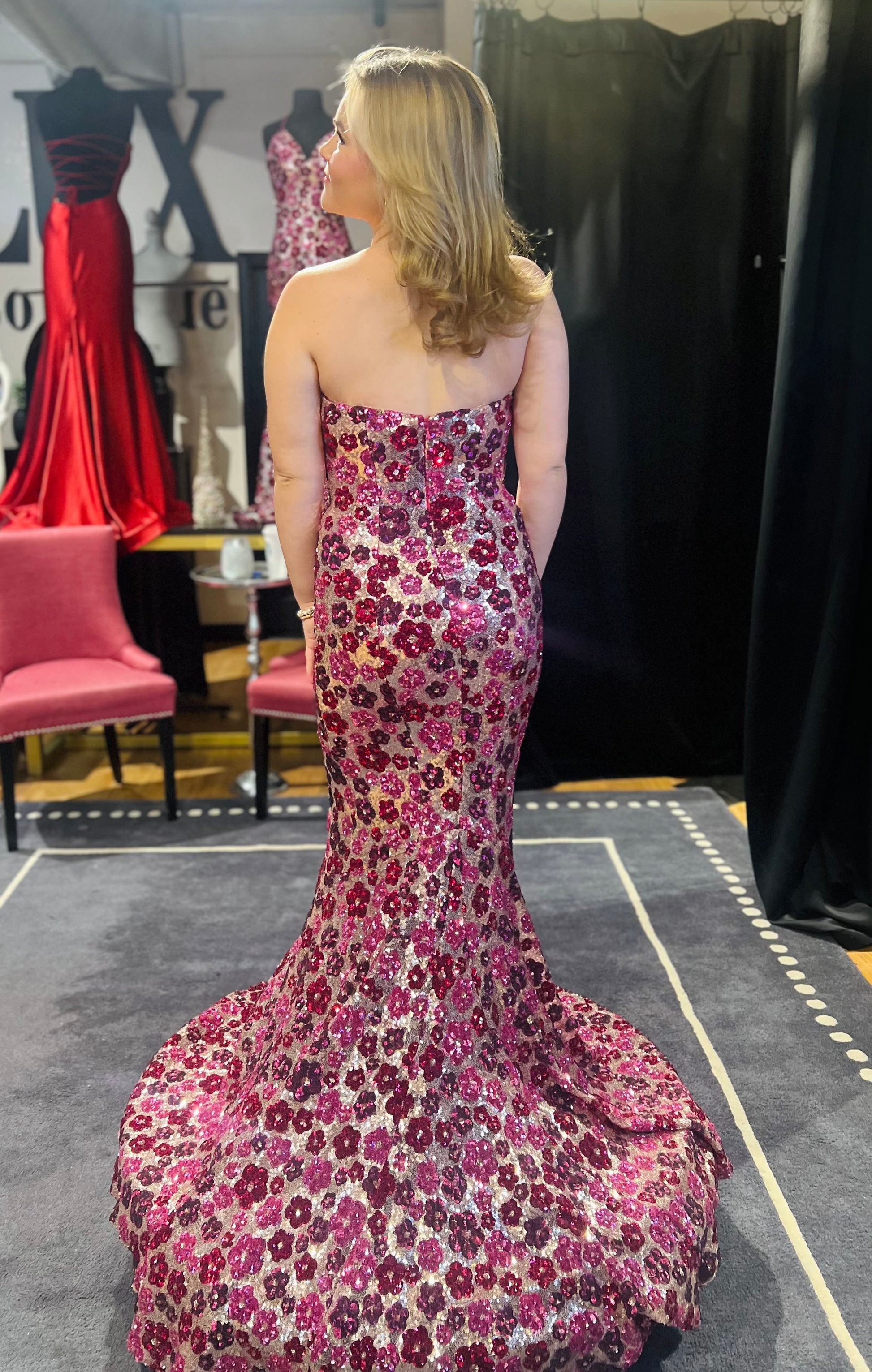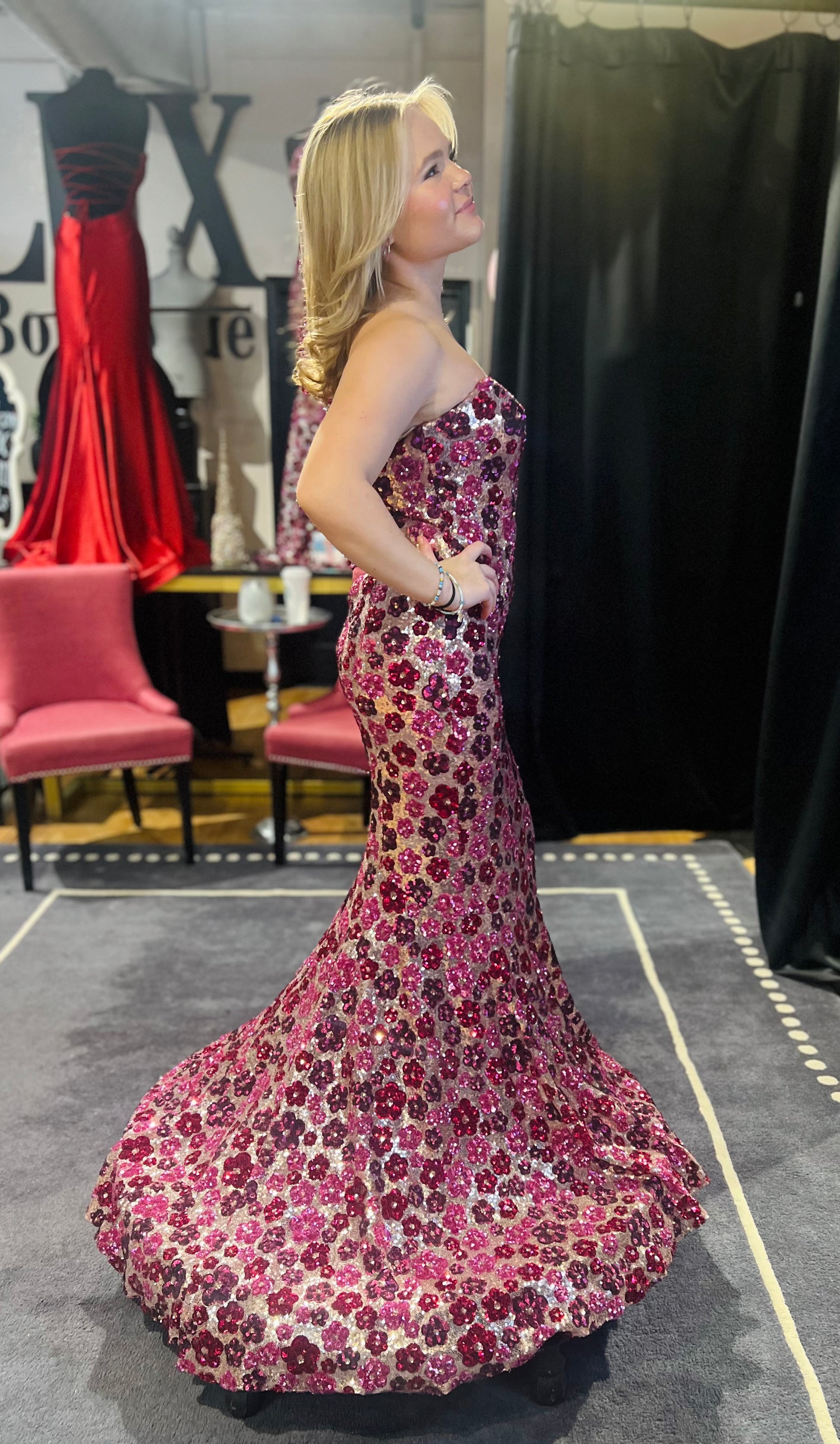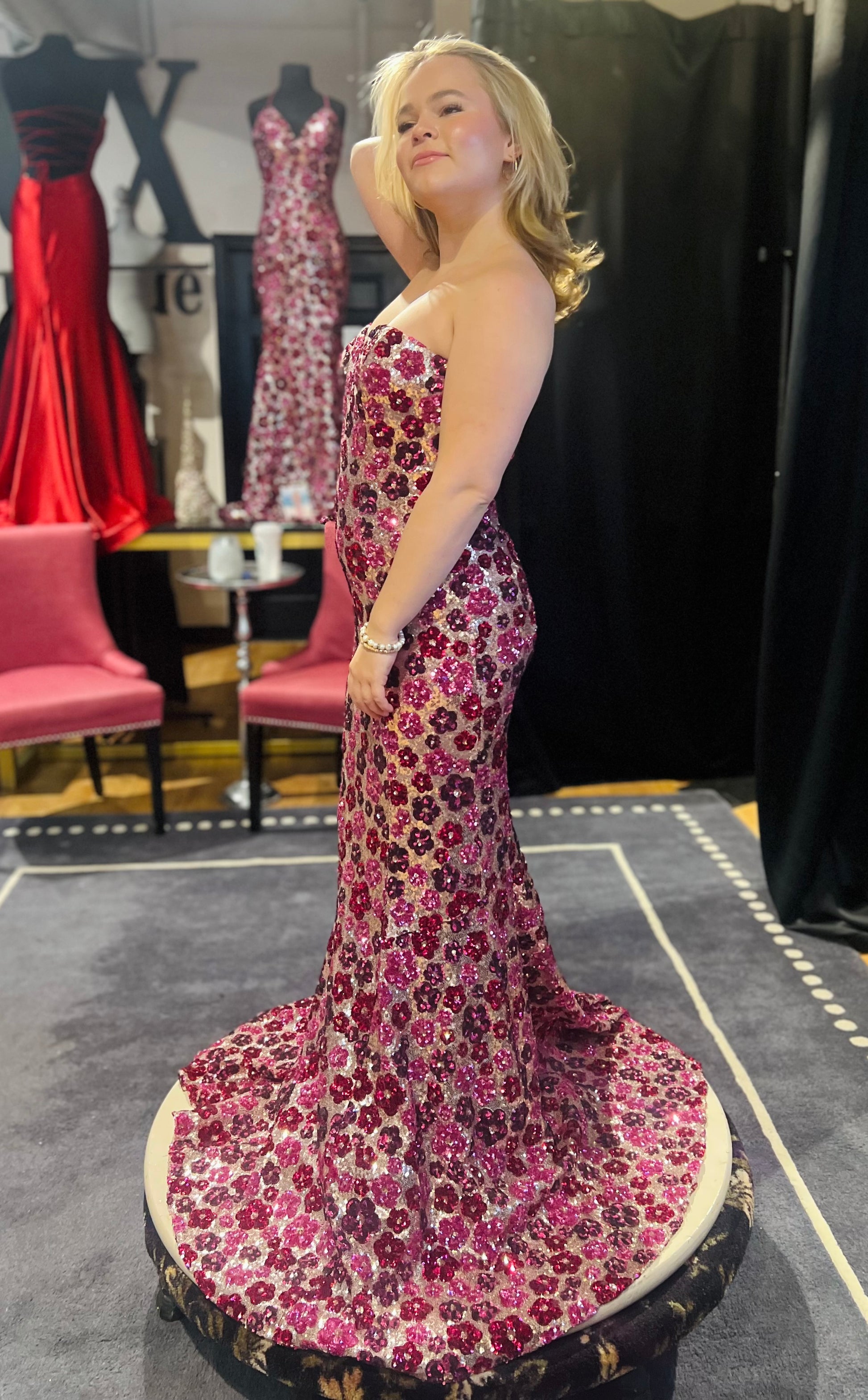 Questo splendido abito presenta una scollatura a cuore ed è realizzato in uno splendido tessuto di paillettes floreali. Brilla come la stella che sei in questa magica creazione, perfetta per il ballo di fine anno o per qualsiasi occasione speciale!
