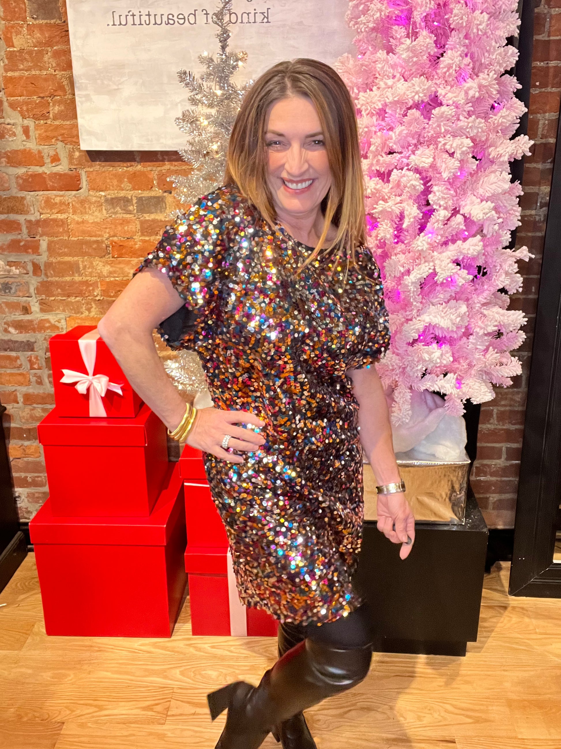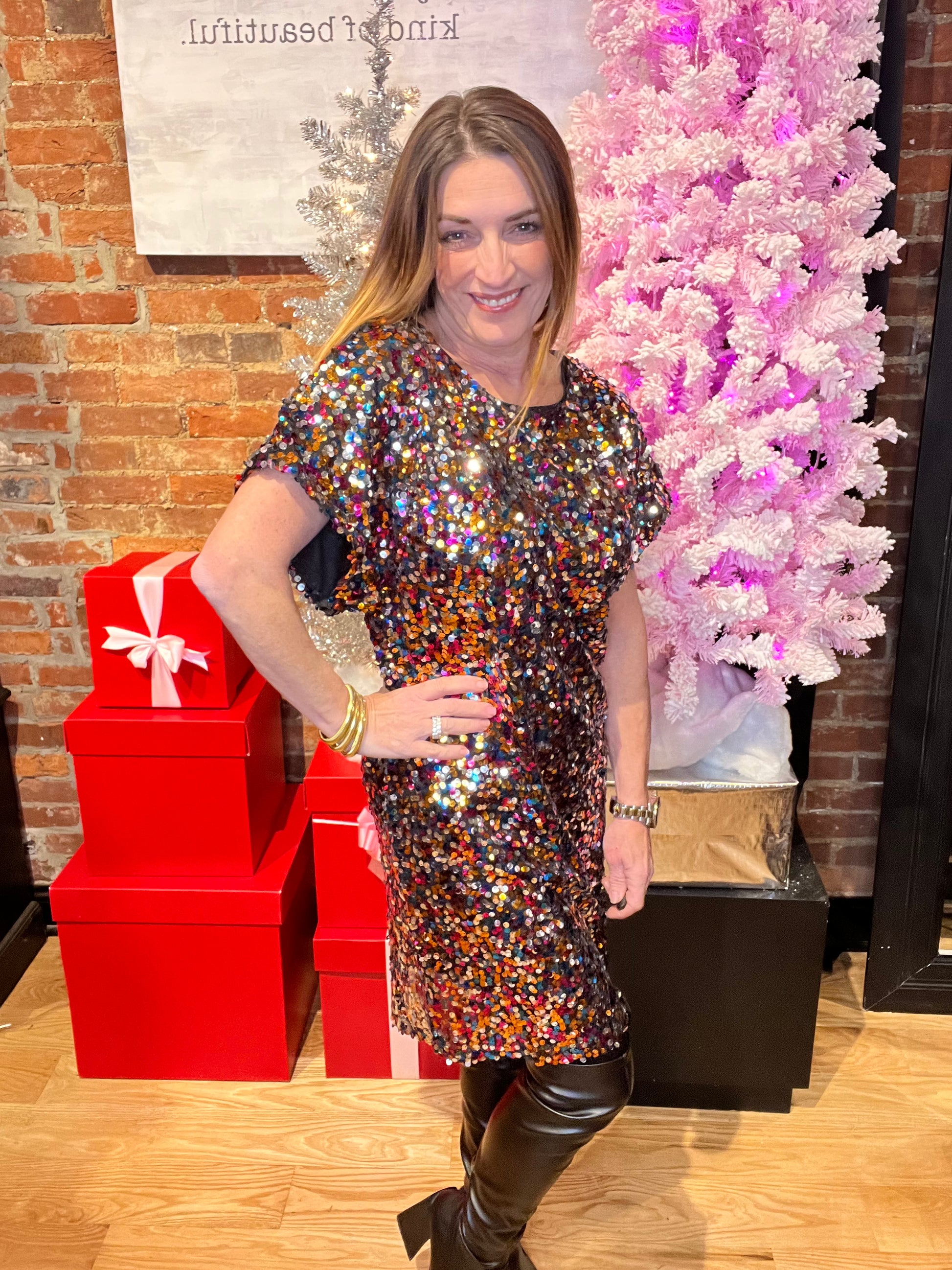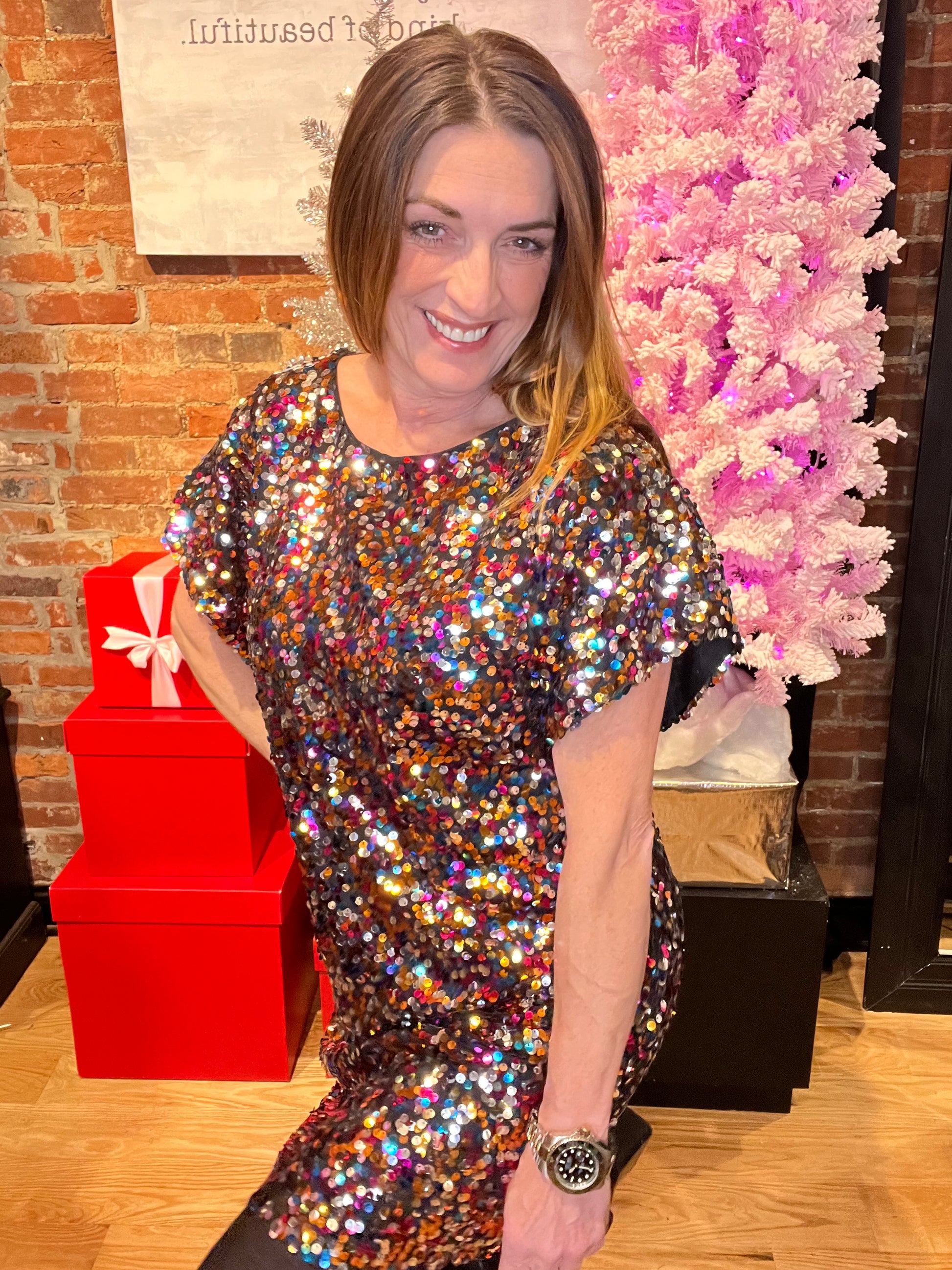 Questo splendido mini abito presenta una scollatura a barca, paillettes multicolori e maniche corte, creando una vestibilità comoda perfetta per un'occasione festiva. Sii l'anima della festa, alla moda, con questo mini abito scintillante!