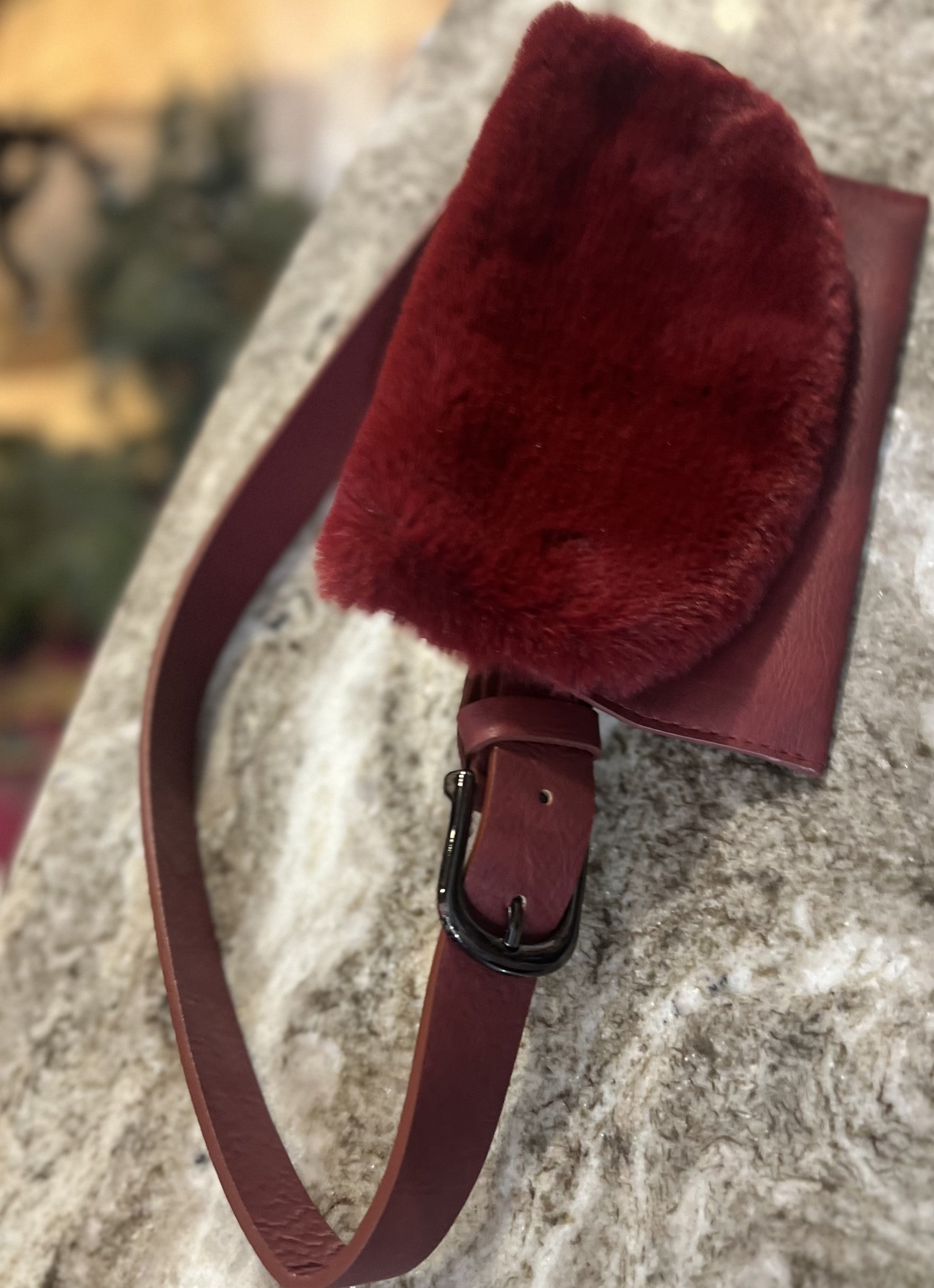 Faux fur envelope style bag adorns the leather belt with a front flap, and a hidden magnetic closure that opens to reveal a perfect pouch for your favorite lipstick! Adjustable belt loops allow you to customize for the best fit.