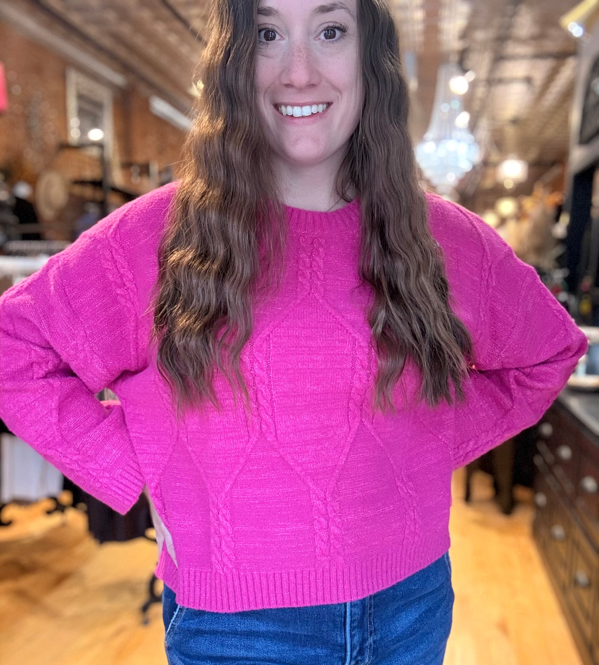 Classic cable knit shapes a relaxed-fit bodice with a crew neckline and long sleeves with drop shoulders and a simplified, ribbed knit design. A slightly cropped hem completes the look.