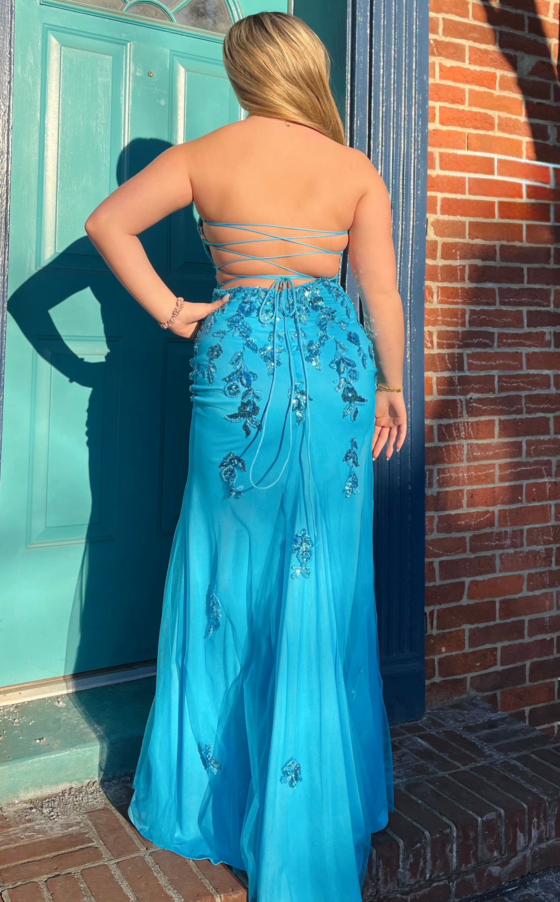 The mermaid skirt and beaded lace details are sure to make a statement, and the lace-up back will keep you party-ready all night long!
