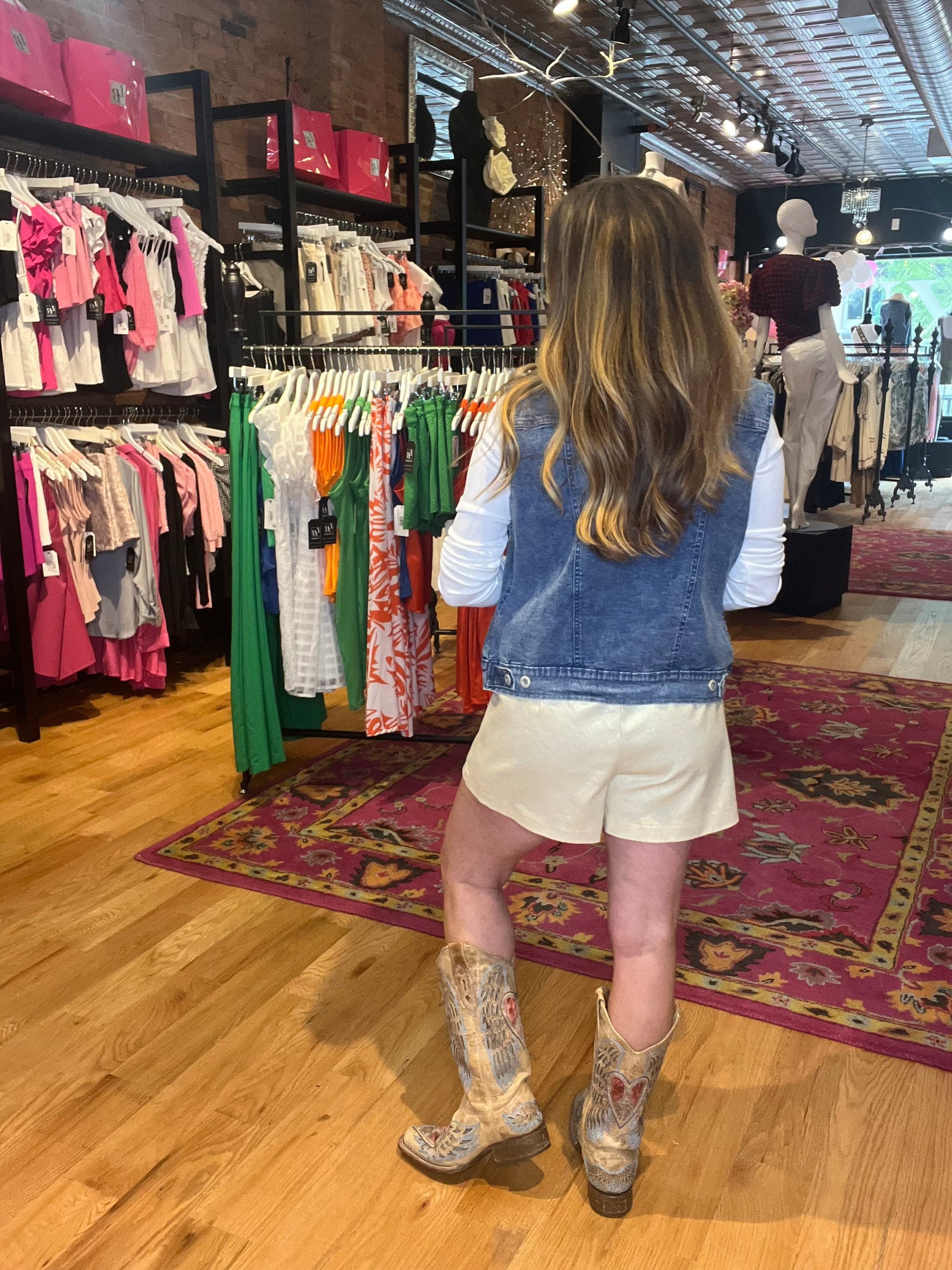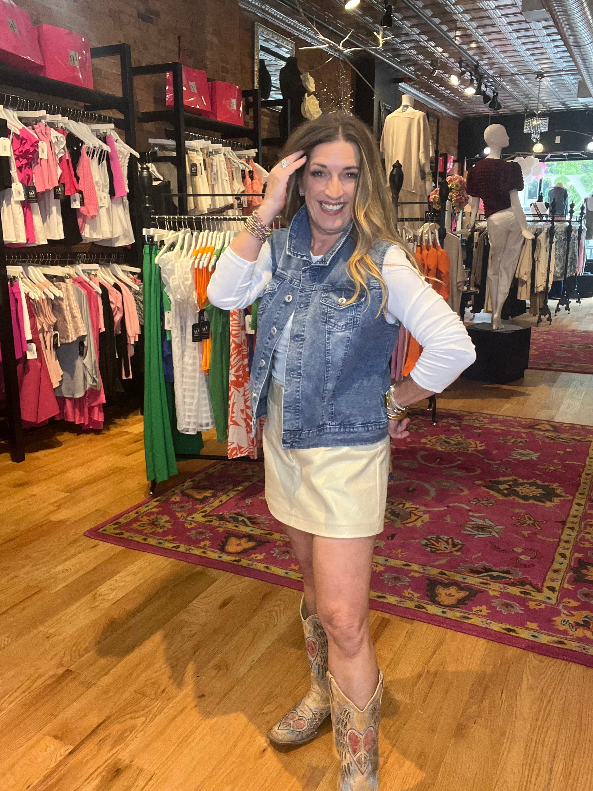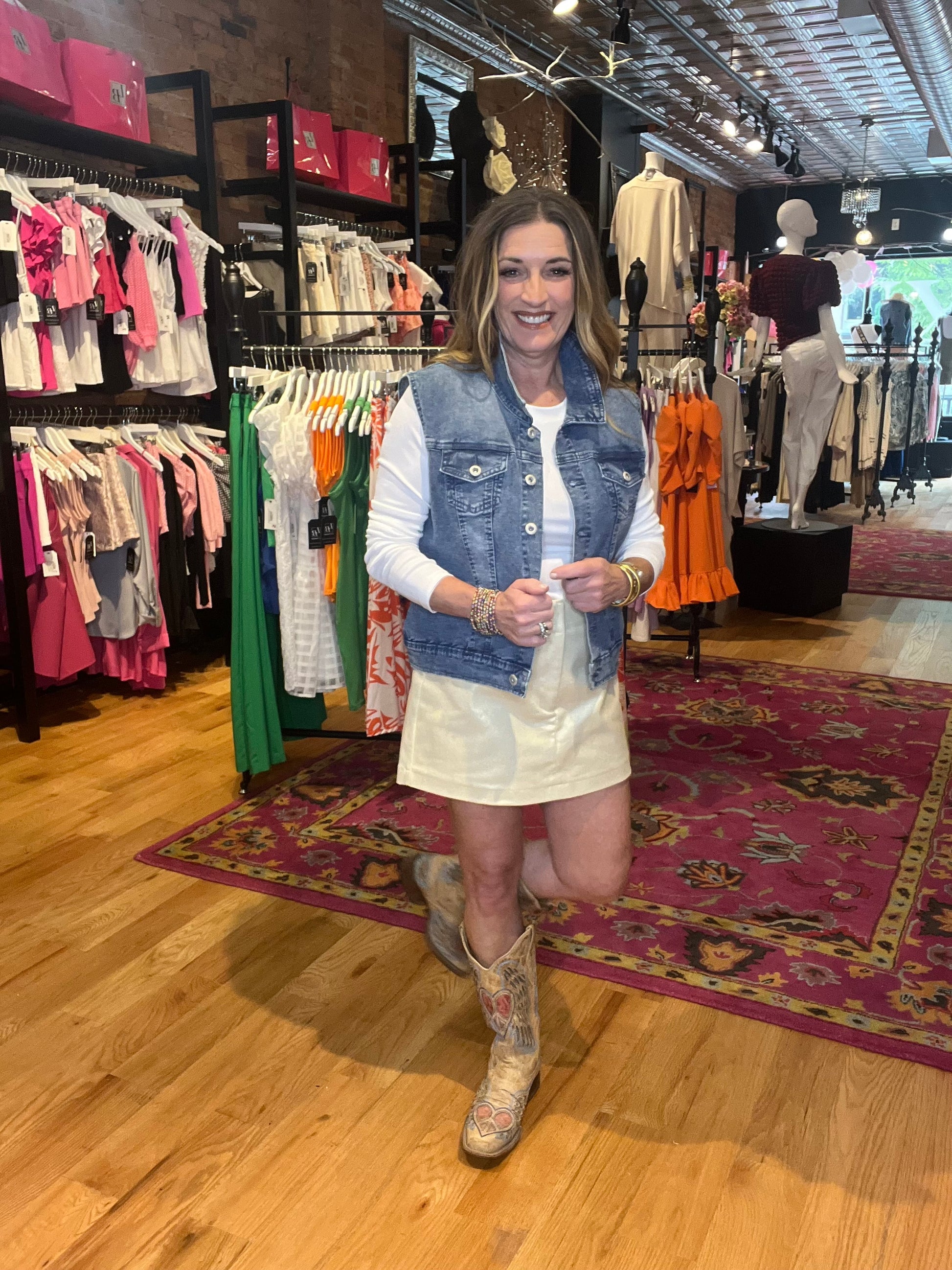 Shiny and textured metallic vegan leather shapes this edgy skirt that features a high-rise fit complete with belt loops, trouser pockets, and a zip fly with a top button closure. The classic A-line silhouette falls to a flirty mini hem.
